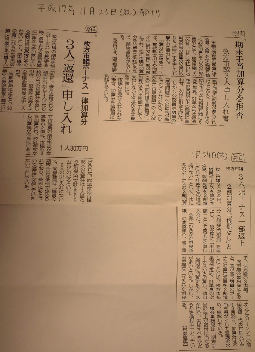 2005年11月23日(祝)読売、朝日の朝刊、24日(木)毎日新聞朝刊