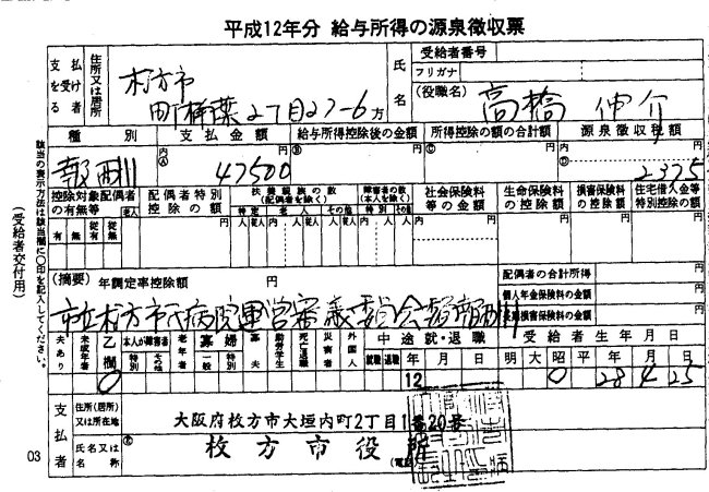 平成12年度分の源泉徴収票です。 (画像をクリックすると新しいウインドウが開き拡大表示されます。) 平成12年(2000年) 年収(議員報酬)そのまんま。