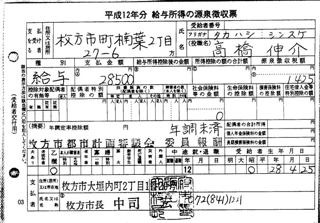 | 左から年収、淀川左岸流域下水道組合分(派遣議員報酬)、枚方市都市計画審議会(委員報酬) | |||||||||||||||||||