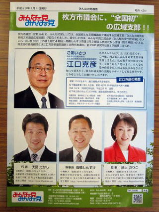 11.2.28 PM 4:20 (月) ひらつー 先週、ある方から「枚方つーしん」に私の日記が紹介されているよ、と連絡をお受けしました。記事には私が25日にアップした中核市についての日記が紹介されています。 実はお聞きするまで「枚方つーしん」については知りませんでしたので、お教えいただき大変参考になりました。 枚方のことについて様々な視点から記事となっています。・こ、これは・・これは・・・役所の「広報」にしたいですね。 ウーム・・・「ヒトツナギ」のコーナーもいいな・・・でも議員としては1月8日にアップされていた消防出初め式前日のリハーサル風景。サイレンの一斉吹鳴(いっせいすいめい)がどのようなものかご体験ください。 さて、朝の楠葉駅前の方は雨にもかかわらず、挨拶運動の方、CHI議員、共産党さんの新人、伏見議員と4陣営であったそうです。 挨拶運動の方は平野衆議院議員の秘書さんであっただけに、さすがに小沢一郎流選挙戦略を完璧にこなしておられるように思います。地域への浸透も完璧です。大変熾烈な戦いです。私は早くも戦線脱落の様相ですが、ガ、ガンバリマス。 11.2.27 PM 5:10 (日) 選挙とは・・・ 4月に選挙を控え選挙事務所の立ち上げや各種集会が催されています。もっとも一人選挙の私には無縁のことなのですが、昨年合流したみんなの党との関係で「枯れ木も山の賑わい」的にお呼ばれいたします。 お呼ばれして感じることは「選挙とはこんなにも熱いものなのか」というものです。現職である私と市民の皆様との政治に対する感覚はそう変わるものではないと思っていますので、この驚き感覚は12年目にして従来の選挙を知ったということになります。バック・トゥー・ザ・フューチャーです。(古い!) 私も民間時代は、事務職時代の仕事と営業としての個人技+チームワーク、そして友禅職人技と会社経営職などを経てきました。その実務経験から、一般市ぐらいならば一人選挙でも可能と判断し実践してきました。 しかし、いろいろとお呼ばれをいただく中で感じることは、やはり選挙というものは多くの方々の熱い応援を間近にしながら「がんばるぞー」とやる方が楽しいような気もする今日この頃です。 ・・・一人選挙の元祖としてはここにいたって宗旨替えをするわけにも行かず、・・・一人で「がんばるぞー」でガンバリマス。 11.2.25 PM 5:10 (金) 唐突 23日に市長から各派代表の携帯に突然電話があったそうです。内容は中核市に向け、府とテーブルに着くというものです。 特例市である枚方市の中核市構想は2006年に面積要件が廃止されたことを受け、副市長を3人まで置けるようにするなど中司前市長が積極的に準備を進められてきた経緯があります。 竹内市長が就任後、コストやリスクを理由に中核市については取りやめられました。それが突然の復活となったわけですが、いつものことながら議会にはまったく事前の話はなく、まるで思いつきのように言葉にされる姿は管総理のようです。 4月の統一選挙の後、9月に単独で市長選挙があることも認識されていないようです。 11.2.24 PM 4:50 (木) 昨日の立候補者説明会では新人、現職を含め50名(定数34人)ですが地域によっては悲喜交々のドラマがあるようです。まだ数名の方が立候補を考えておられるようです。 さて、午前中、各派代表者会議のあと議会運営委員会が開かれ、議会日程が組まれました。3月3日に本会議初日となります。7日に文教常任委員会付託事件審査(中学校給食)があり、8日は厚生常任委員会付託事件審査(国保料)があります。9日と10日は各会計予算に対する代表質問が行われ、14日が議会最終日となります。 今議会では統一地方選挙のため、市長の市政方針演説は行われず、暫定予算の代表質問だけで終わります。予算特別委員会もないため何か寂しいものを感じますが厳しくチェックをしていきます。 代表質問は会派代表として伏見議員が行う予定です。最後の最後まで市議会議員としての仕事を仕上げて府議選にチャレンジされるのだと思っています。 11.2.23 PM 4:40 (水) 駅前報告 22日 PM 5:00-6:50 くずはモール前 642回目 昨日も夕方に駅前報告を実施しましたが途中から平和系の団体の方とバッティングしました。駅前報告後、枚方南部方面の政治情勢について現地(光善寺)に赴き意見交換をいたしました。現時点では南部方面は堅調に推移、中央部と東部はまずまず、北部方面が現職を含め超激戦区といった印象です。 さて、午後から市会議員選挙の立候補者説明会が開かれました。50名前後(定数34名)の方の参加があったようですが、まだ数名増えそうです。前回に続き激戦となります。 11.2.22 PM 1:30 (火) 駅前報告 21日 PM 4:50-7:05 くずは駅中央 641回目 この国の行く末 朝の駅前報告のための場所確保が失敗続きのため、仕事の段取りを変えて夕方に時間を作りご報告しました。が、朝と比べて大変効率が悪くなっています。おまけに昨日から花粉症の症状が出てきました。トホホです。まったく。 昨