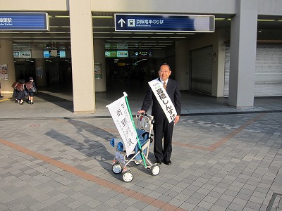 | 告示日の朝、地元の京阪電車樟葉駅前にて。このスタイルも4回目となりました。 | ||